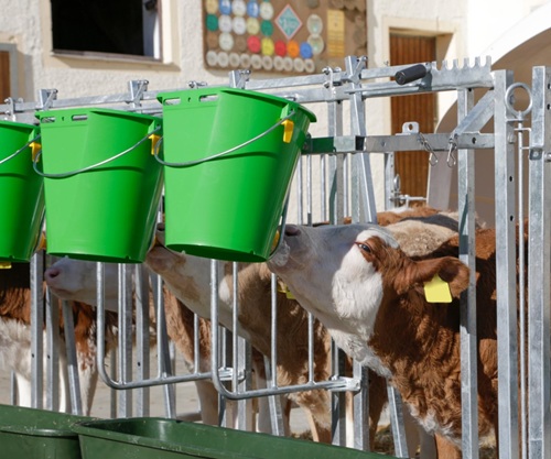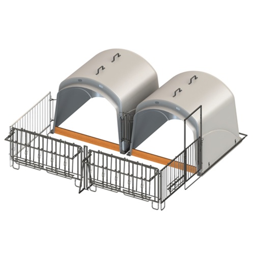 capanna per gruppi di vitelli, doppia, con recinto. in plastica rinforzata con fibra di vetro. Finestra scorrevole per controllo e rifornimento fieno