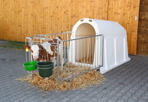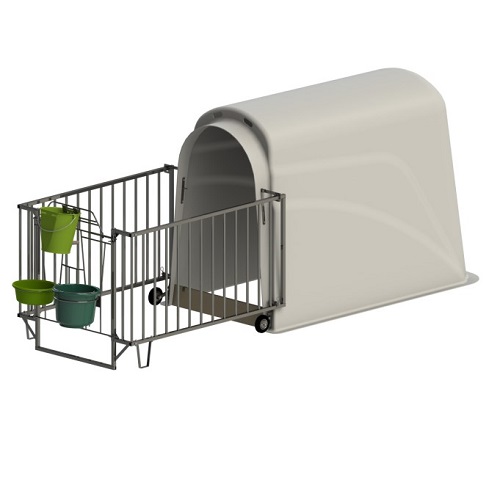 capanna per vitelli con recinzione esterna. Realizzata in pregiata plastica antiurto. Porta girevole multifunzione. Spostamento agevole grazie ai grandi pneumatici in gomma con cuscinetti. Garantita stabilità elevata e lunga durata. Sportello di ventilazione regolabile e tettoia ascendente con bocche di ventilazione assicurano una climatizzazione perfetta. Agevole il rifornimento di fieno, molto semplice la pulizia grazie alle pareti interne perfettamente lisce, ottima l’igiene.