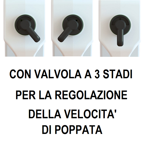 con valvola a 3 stadi che permette la regolazione della velocità di poppata, dotato di chiusura a vite e gradazione