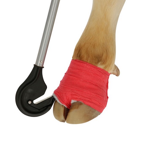 coltello con prolunga per rimozione facile e sicura bendaggi zoccoli. Ha forma curva per lavorare senza infortuni. La lama è molto affilata e sostituibile.
