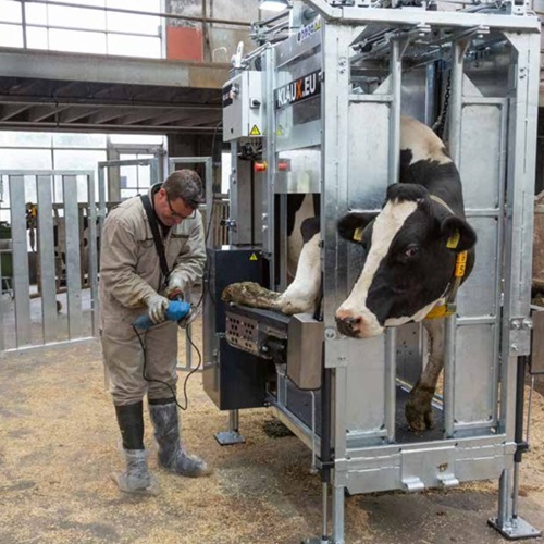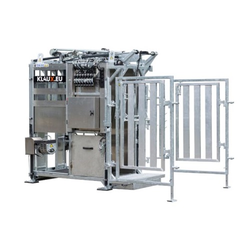 Travaglio completamente zincato ed idraulico con azionamento a 380V, professionale e versatile, ideale per grandi allevamenti di bovini da latte, veterinari e maniscalchi professionisti. Ergonomico per operatori e animali. Funzionamento principale a cilindri. Dotato di staffa di fissaggio doppia, ascensore con arresto automatico, persiane laterali sulle zampe anteriori, scatola porta attrezzi riscaldata e con illuminazione, pavimento piano senza ostacoli, occhielli di sollevameto, porta-forche per pallet, controllo remoto su 4 funzioni (porte anteriori, portellone posteriore, verricello per cinghia addominale e verricello per zampe postriori). Box rialzato sulla postazioni di lavoro. Espandibile con varie opzioni e dotato di vari accessori opzionali. Funzionamento sicuro a basso voltaggio (24V).