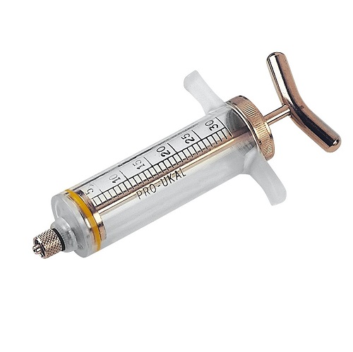 siringa in plastica stampata, 30 cc , con pistone, tappo e asta in ottone nichelato
