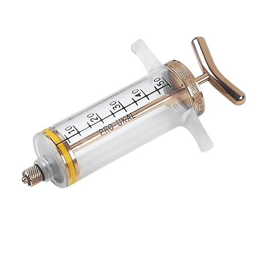 siringa in plastica stampata, 50 cc, con pistone , tappo e asta in ottone nichelato