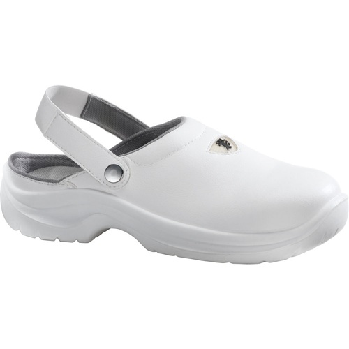 zoccolo protettivo basso in microfibra, con puntale in materiale termoplastico, fodera interna traspirante e antiumidità, soletta interna amovibile antistatica e con trattamento antibatterico, suola in poliuretano monodensità, cinturino posteriore elasticizzato amovibile.